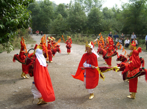 曉道竹馬是流傳于嵐皋縣曉道鄉(xiāng)的一項在春節(jié)期間開展的民俗演藝活動。此項活動的道具是竹馬,用竹子編成兩個直徑0.5米的框子,安上馬頭和馬尾,糊上皮紙;再用紙貼上馬毛,用繩子將馬頭、馬尾固定在兒童身上。