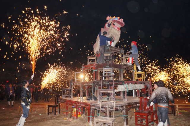 表演開場(chǎng)時(shí),領(lǐng)鞭人于頂層倒立,腿蹬三下,而后響鞭四方以敬諸神。鞭落,一群旗帆、竹馬吉語(yǔ)吶喊,圍桌跑圈。隨即,三聲鞭響,鑼鼓齊鳴,領(lǐng)獅人引獅從四角涌上,斗技爭(zhēng)霸,好戲正式開場(chǎng)。