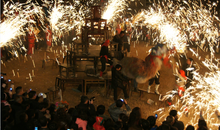 翻天印是盛行在安康漢濱區(qū)恒口、五里、建民一帶的民間表演, 是傳統(tǒng)舞獅中最驚險(xiǎn)、最熱鬧的一種表演形式,屬“火獅子”。該表演興起于清代,是漢濱人民在長(zhǎng)期生產(chǎn)、生活中創(chuàng)造的民俗文化。