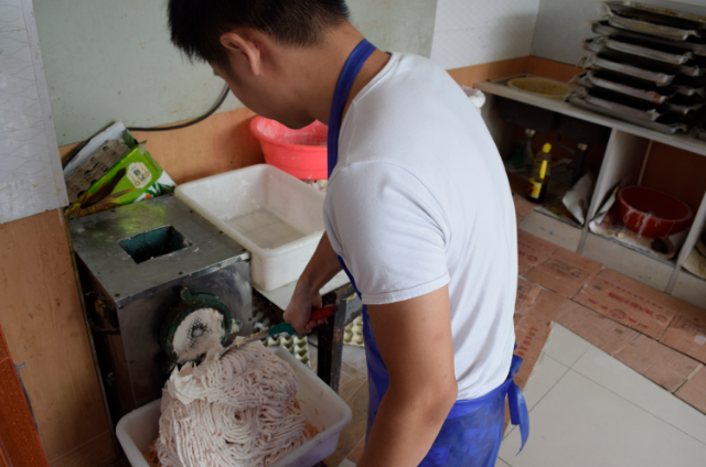 白河肉糕配料精心,豬肉要選七分肥三分瘦,雞蛋需要分離蛋清、蛋黃。其制作工序較為復(fù)雜:首先,將清洗過(guò)的肉放在砧板上,用木杖槌搗成泥,用水調(diào)和均勻。其次,加入適量的淀粉、蛋清,配以鹽和適量蔥姜汁等佐料攪拌均勻。再次,把蘿卜切成條塊,在蒸籠里擺成長(zhǎng)方形模具狀,填入搗好的肉泥,蒸十分鐘。待初步定型后,取籠往肉糕上均勻涂抹蛋黃,每蒸五分鐘涂抹一次。如此三次過(guò)后,正宗的肉糕才算做成。