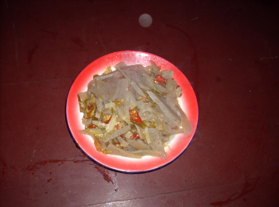 魔芋豆腐淀粉膨脹力很強(qiáng),一斤鮮魔芋可制成5~7斤魔芋豆腐。制成的魔芋豆腐灰黑光鮮,柔軟潤滑,綿嫩如玉,手感細(xì)膩,富有彈性。烹炒時將魔芋豆腐切成片或絲放入鐵鍋中,加醋或漿水煮開,撈出后用清水漂兩三次,除去堿味,再放入油鍋,與其他葷素菜料相配,炒、燜、熘均可。
