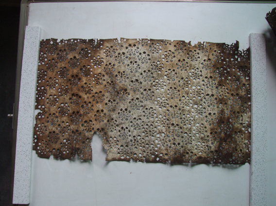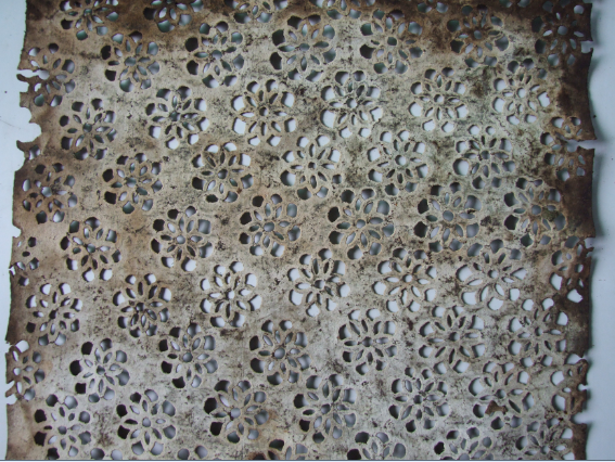制作藍印花布的工藝流程很復雜。首先從蓼藍草中提取藍作染料(靛藍),把鏤空花版鋪在白布上,用刮漿板把防染漿劑刮入花紋空隙漏印在布面上,干后放入染缸,將布放入缸中浸染20分鐘,而后取出氧化、透風30分鐘,一般經(jīng)過6至8次反復染色,直到達到所需顏色為止。再將其拿出,放在空氣中氧化,晾干后刮去防染漿粉,即顯現(xiàn)出藍白花紋。因為是全手工印染,干后的漿不免會有裂紋,形成手工藍印花布特有的魅力——冰裂紋。