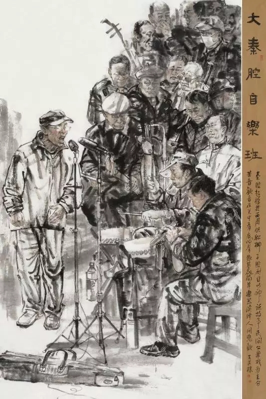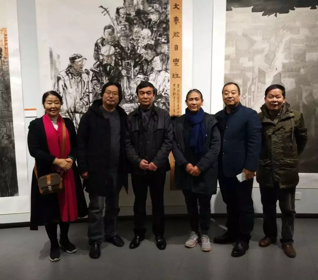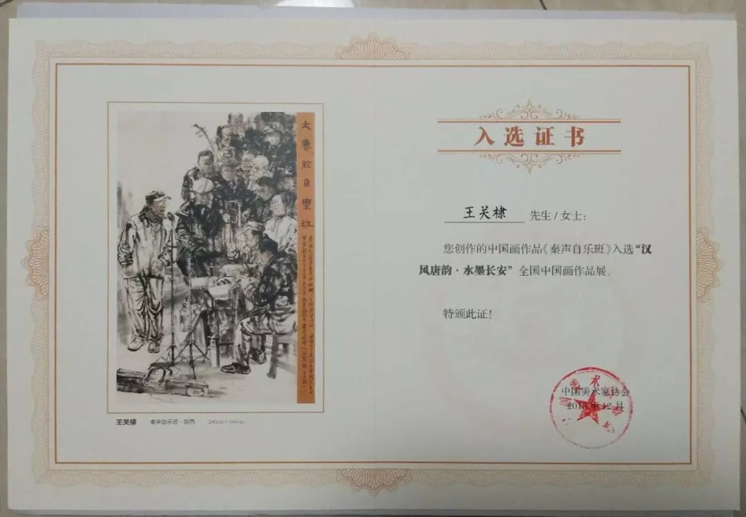 王關(guān)棣的入選作品《大秦腔.自樂(lè)班》取材于陜西秦腔藝術(shù)在普通百姓中的流行狀態(tài),以大寫意的筆法,抒寫了秦腔蒼健激越的藝術(shù)風(fēng)格,表現(xiàn)了陜西關(guān)中人物的憨厚、質(zhì)樸、曠達(dá)。展覽期間,眾多觀者駐足于該作品前,完全沉浸于作品所傳達(dá)的感人力量之中。有兩位陜西師大的老教授特意找到作者,表達(dá)了他們的感受“人物形象生動(dòng)傳神”、“富于感染力”、“筆墨放達(dá)充滿激情”,并勉勵(lì)畫家多表現(xiàn)這類題材。西安美術(shù)學(xué)院院長(zhǎng)、陜西美協(xié)主席郭線廬教授在觀看了該作品后,給予了作品充分肯定并欣然與作者合影留念。