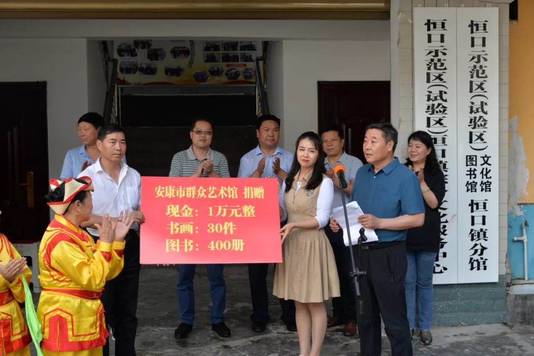 最后,恒口鎮(zhèn)鎮(zhèn)長(zhǎng)張祖武和安康市群眾藝術(shù)館館長(zhǎng)周墻共同為恒口示范區(qū)(試驗(yàn)區(qū))恒口鎮(zhèn)綜合文化服務(wù)中心和恒口示范區(qū)(試驗(yàn)區(qū))圖書(shū)館、文化館恒口鎮(zhèn)分館揭牌。安康市群眾藝術(shù)館為恒口示范區(qū)(試驗(yàn)區(qū))圖書(shū)館、文化館恒口鎮(zhèn)分館捐贈(zèng)專項(xiàng)資金和書(shū)籍、書(shū)畫(huà)作品。
