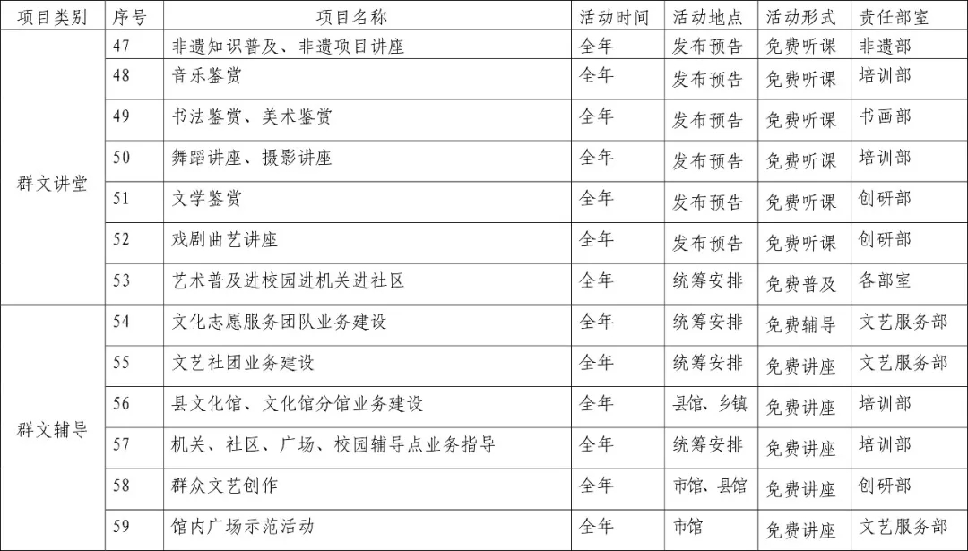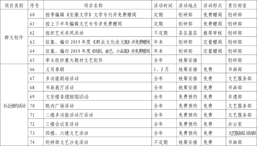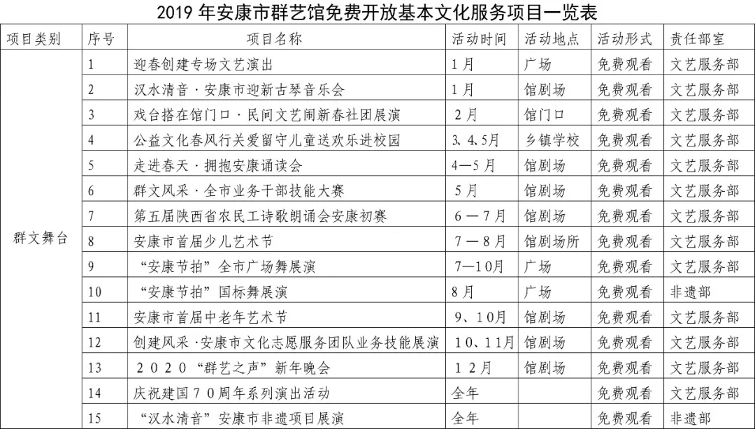 2019年安康市群藝館免費開放基本文化服務項目一覽表