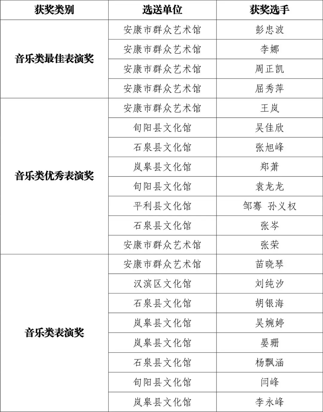 現(xiàn)將群星風采·第六屆陜西省群文系統(tǒng)業(yè)務干部技能大賽安康選拔賽(音舞類)比賽結果公布如下: