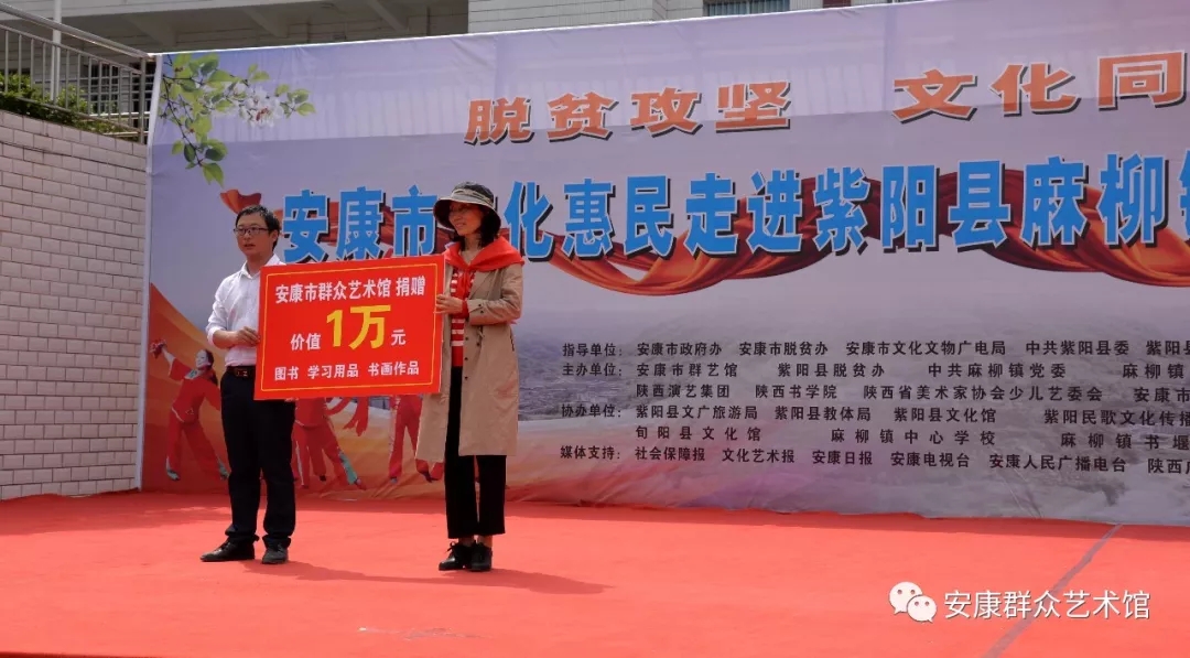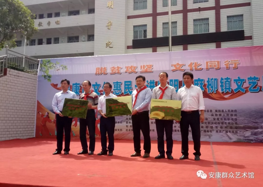 2018年4月27日,由市群藝館、紫陽(yáng)縣脫貧辦、中共麻柳鎮(zhèn)黨委、政府聯(lián)合主辦、陜西演藝集團(tuán)、陜西書(shū)學(xué)院、陜西省美術(shù)家協(xié)會(huì)少兒藝委會(huì)、安康市新華書(shū)店、紫陽(yáng)縣文廣旅游局、紫陽(yáng)縣教體局、紫陽(yáng)縣文化館、紫陽(yáng)縣民歌文化傳播有限公司、旬陽(yáng)縣文化館、麻柳鎮(zhèn)中心學(xué)校、麻柳鎮(zhèn)書(shū)堰村委會(huì)協(xié)辦的“脫貧攻堅(jiān)文化同行”文化惠民活動(dòng)在紫陽(yáng)縣麻柳鎮(zhèn)舉辦。