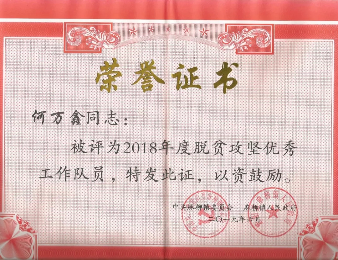 在全國上下共同慶祝中國共產黨98歲生日之際,紫陽縣麻柳鎮(zhèn)評選表彰了一批在精準扶貧工作中成績突出的基層黨組織和先進個人。安康市群眾藝術館扶貧駐村工作隊第一書記何萬鑫同志以其長期扎根扶貧一線,克服困難,任勞任怨的踏實態(tài)度和顯著的工作業(yè)績被麻柳鎮(zhèn)評選為“優(yōu)秀駐村工作隊員”,受到表彰獎勵。